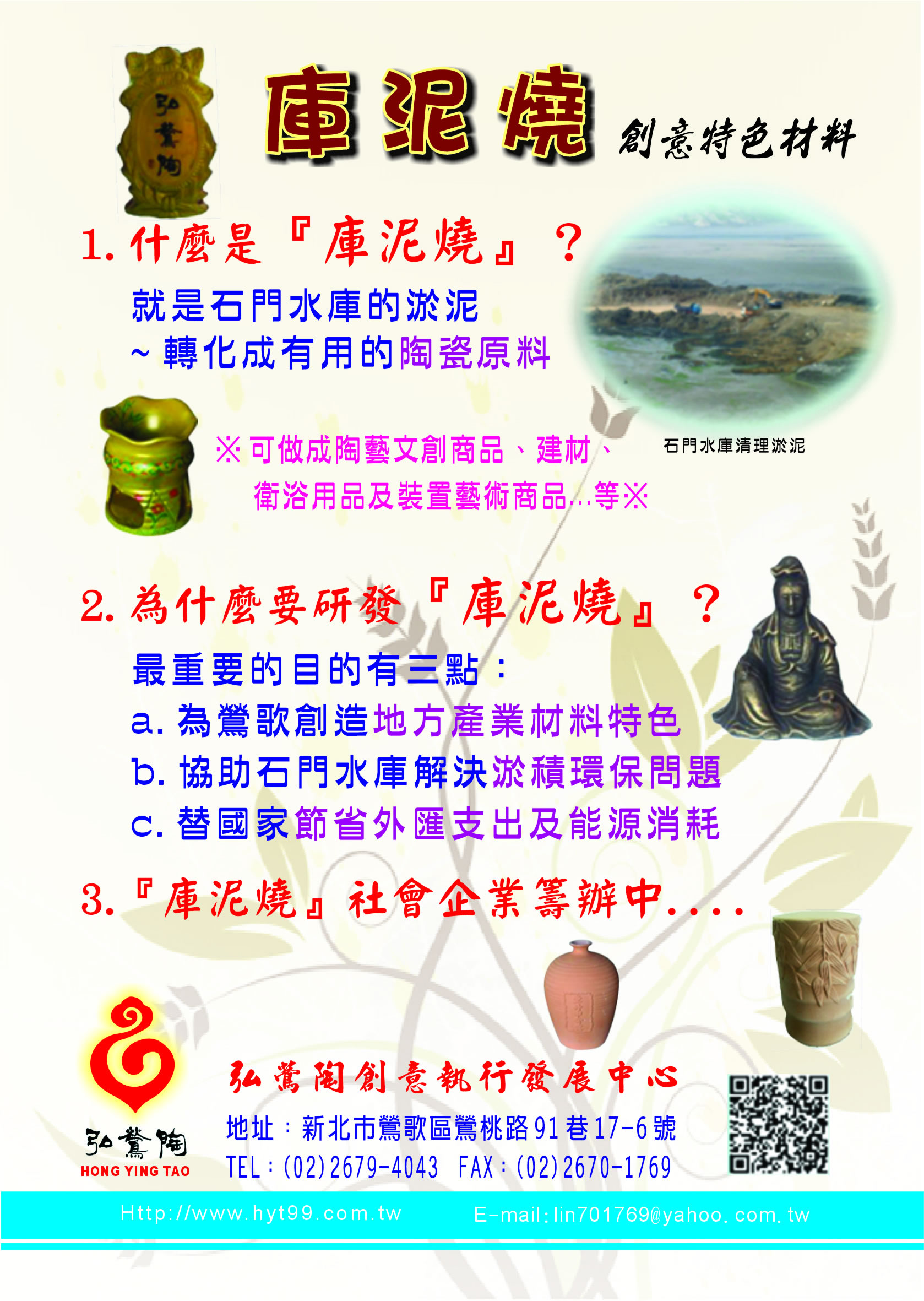 目的:「庫泥燒」符合環保節能與在地原生材料之特性,用於陶瓷文化創意之發展,開發台灣在地特色伴手禮,成為來台觀光客必買的伴手紀念品為我們努力之方向。同時可以協助「石門水庫」處理淤積環保問題。