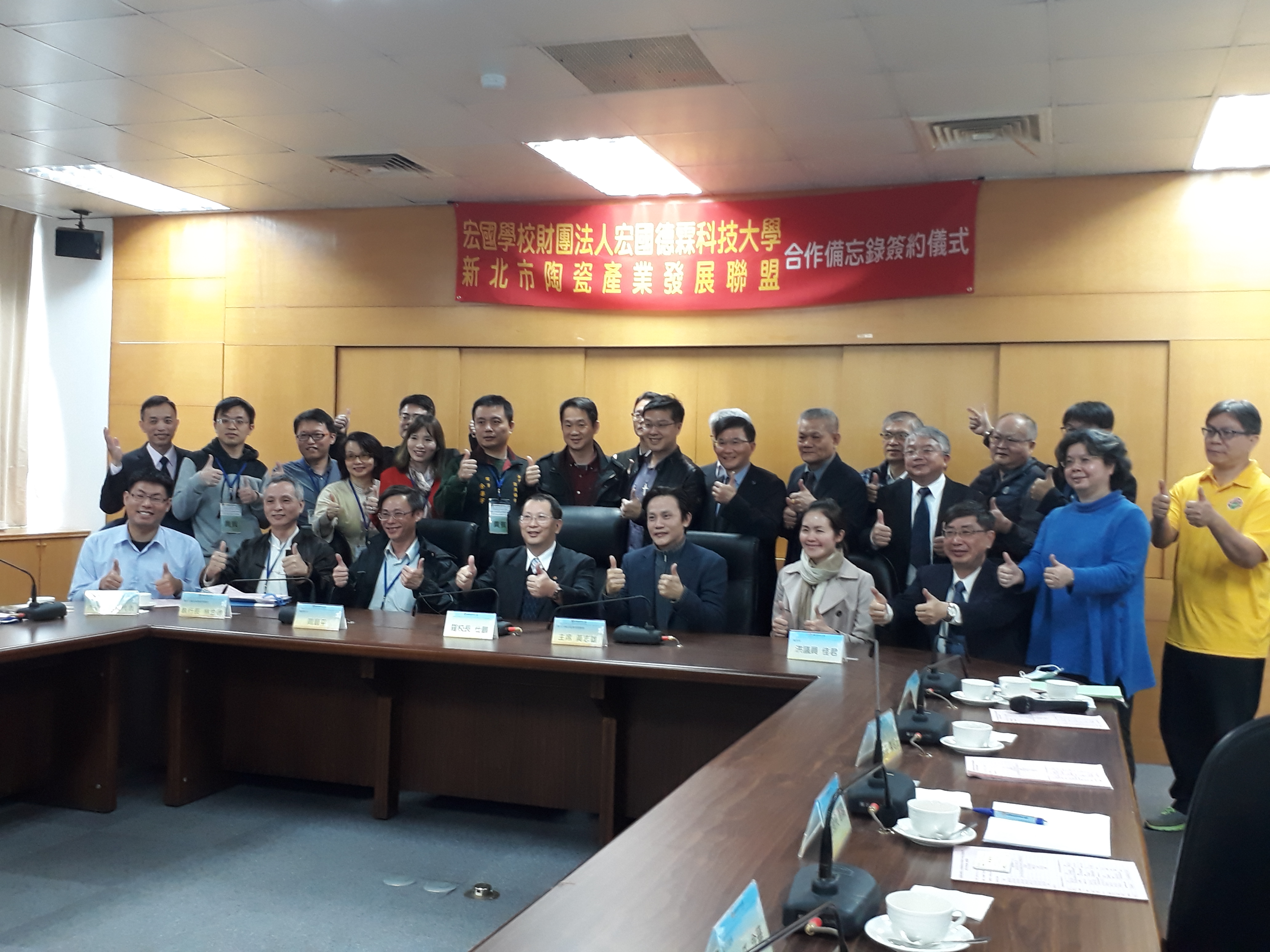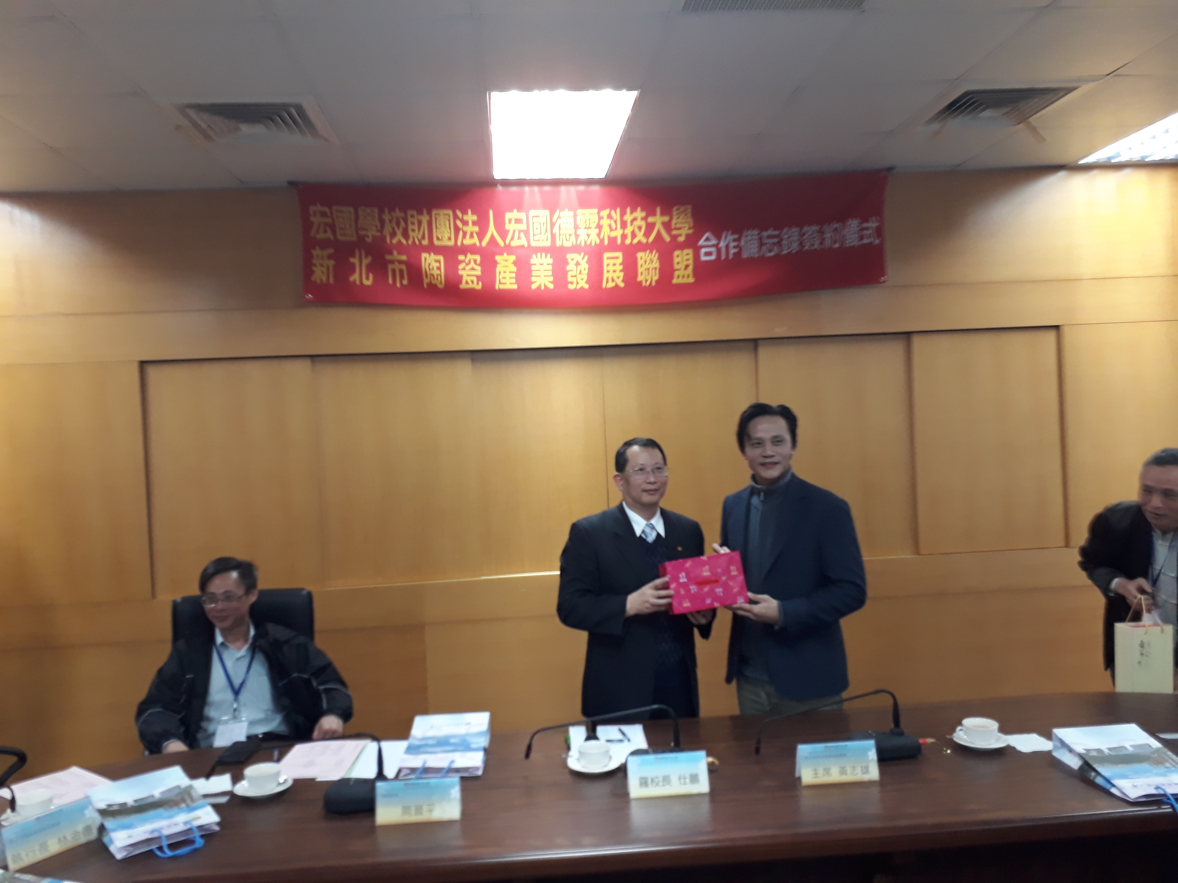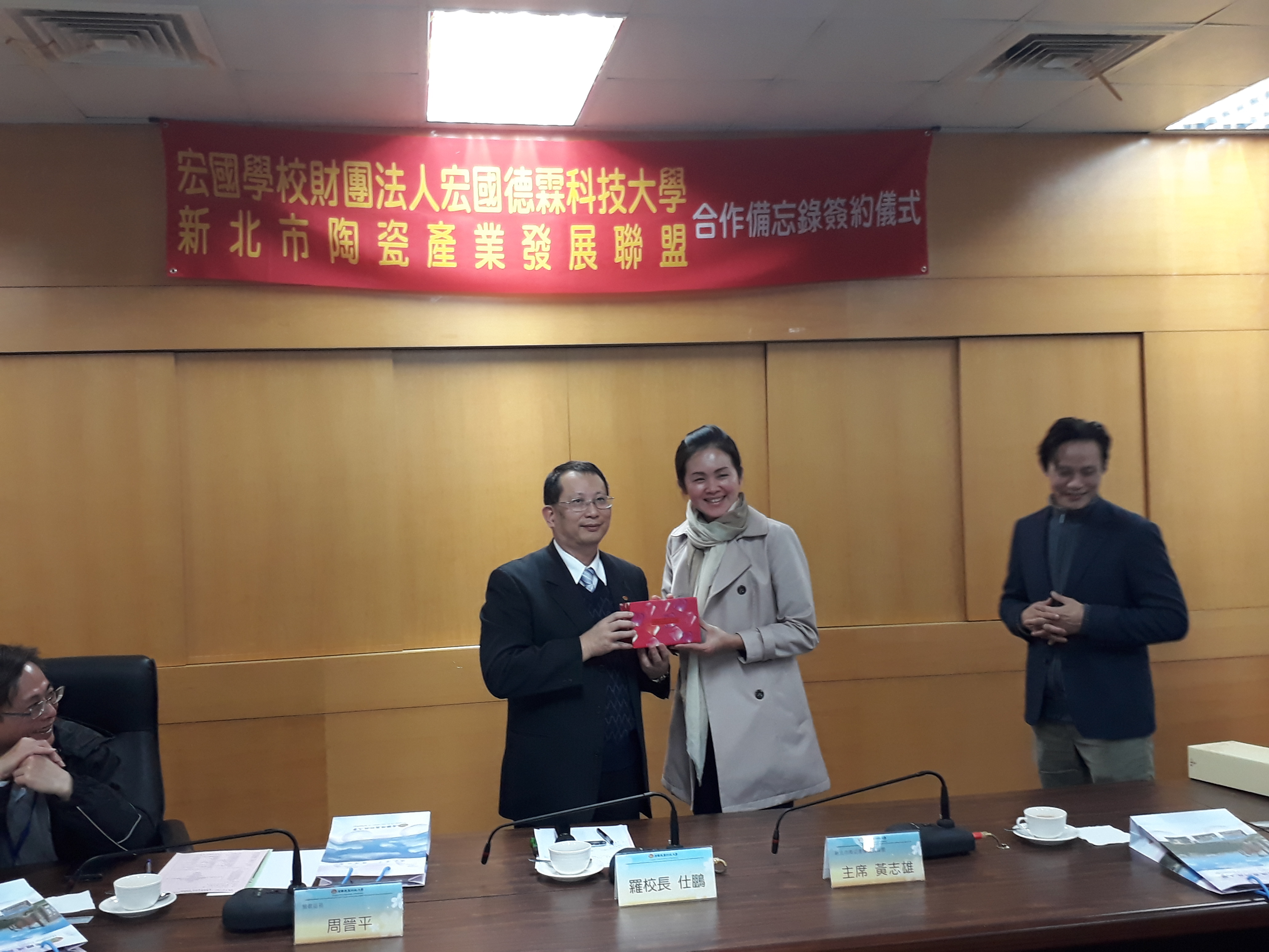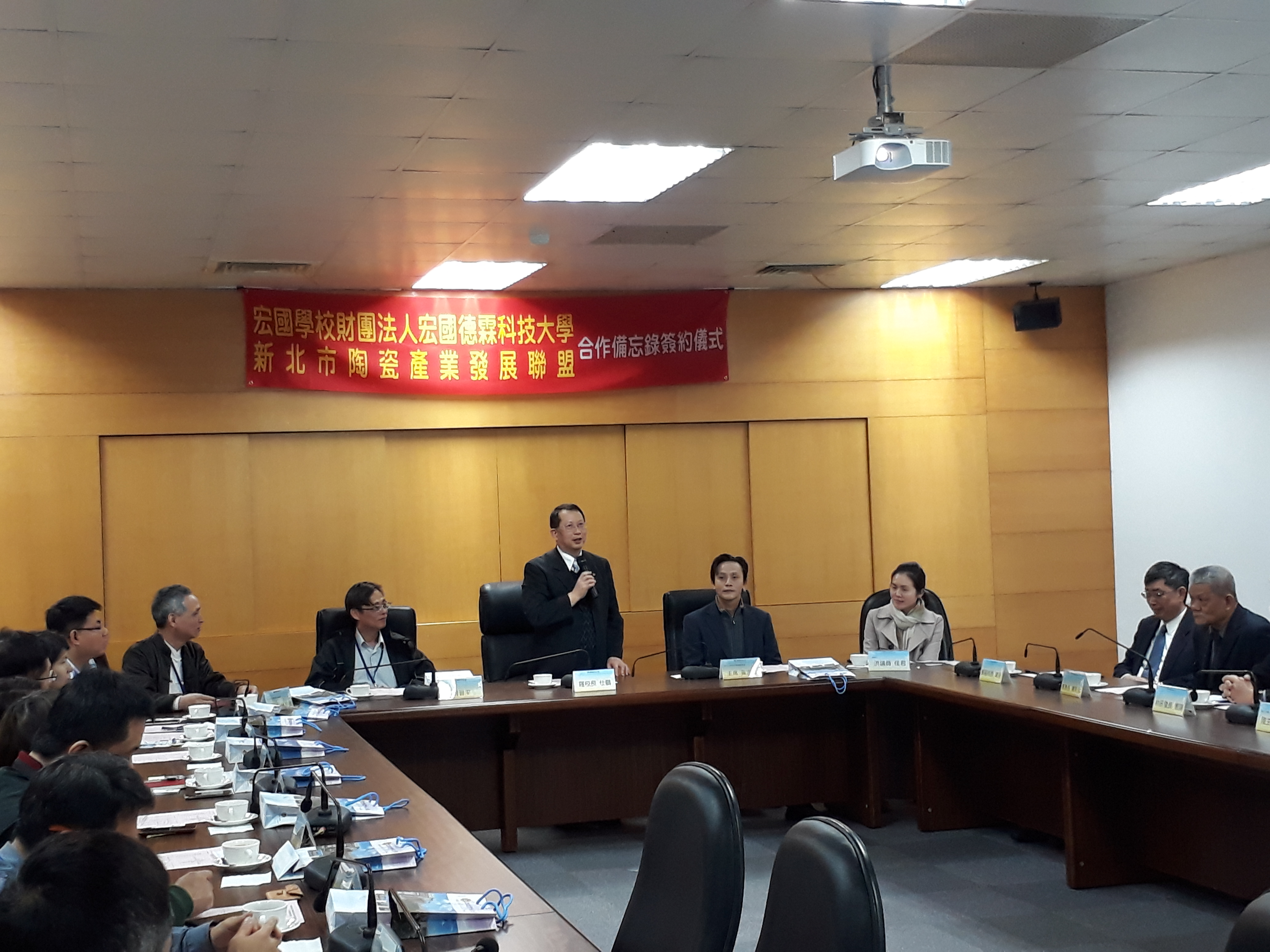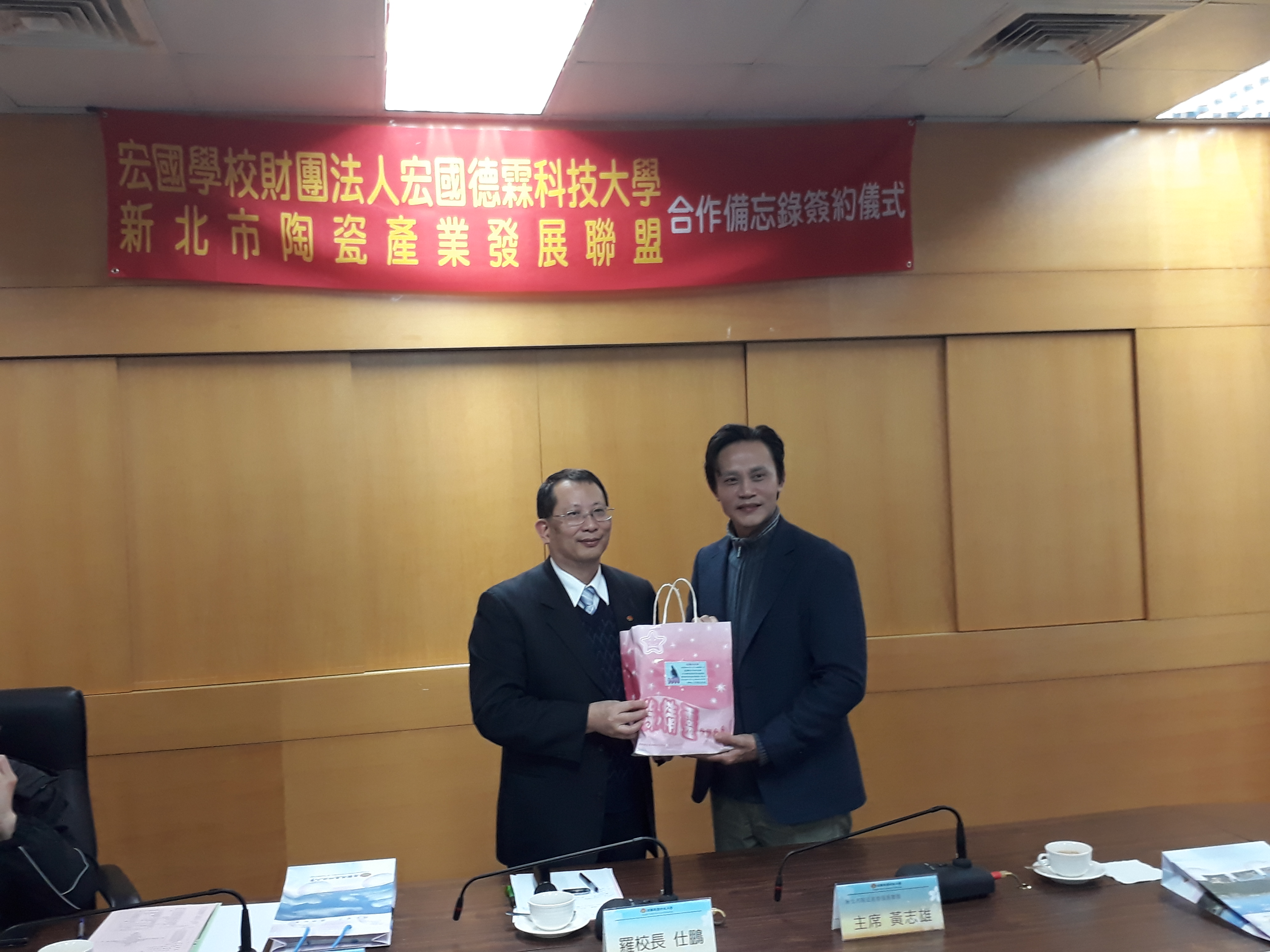 宏國學校財團法人宏國德霖科技大學與新北市陶瓷產業發展聯盟於108年2月26日上午,在該校內堉琪樓會議室,舉行產學合作備忘錄簽約儀式,由宏國學校財團法人宏國德霖科技大學羅仕鵬校長與新北市陶瓷產業發展聯盟黃志雄主席代表簽約。 當日出席簽約儀式的,有新北市政府經發局陳詠順股長、李惠雯科員及鶯歌區長周晉平、新北市陶瓷產業發展聯盟黃志雄主席親自出席本次盛會之外,還有校方出席儀式與會的有羅仕鵬校長、工程學院鄭建銓副校長暨工程學院院長、學務處陳昭元學務長、研發處林憲陽研發長、資工系康才華工程學院助理院長暨資工系主任、機械系李建德主任、電子系陸念華主任、電通系謝文旭主任、創設系林有鎰主任、劉芸華老師、章瑞陽老師、餐旅學院蔡顯榮助理院長等。 鶯歌地方代表出席計有:新北市陶瓷產業發展聯盟林金德執行長、鶯歌陶瓷博物館行銷推廣組程文宏組長、龍珥創意工作室黄政雄、風清堂梁守芬、陶藝驛陶藝社林秋鳳、長興窯余華宇、無限紙器有限公司傅建烔、弘鶯陶創意執行發展中心林琨能、宏洋農業開發股份有限公司劉宏洋等共同與會。