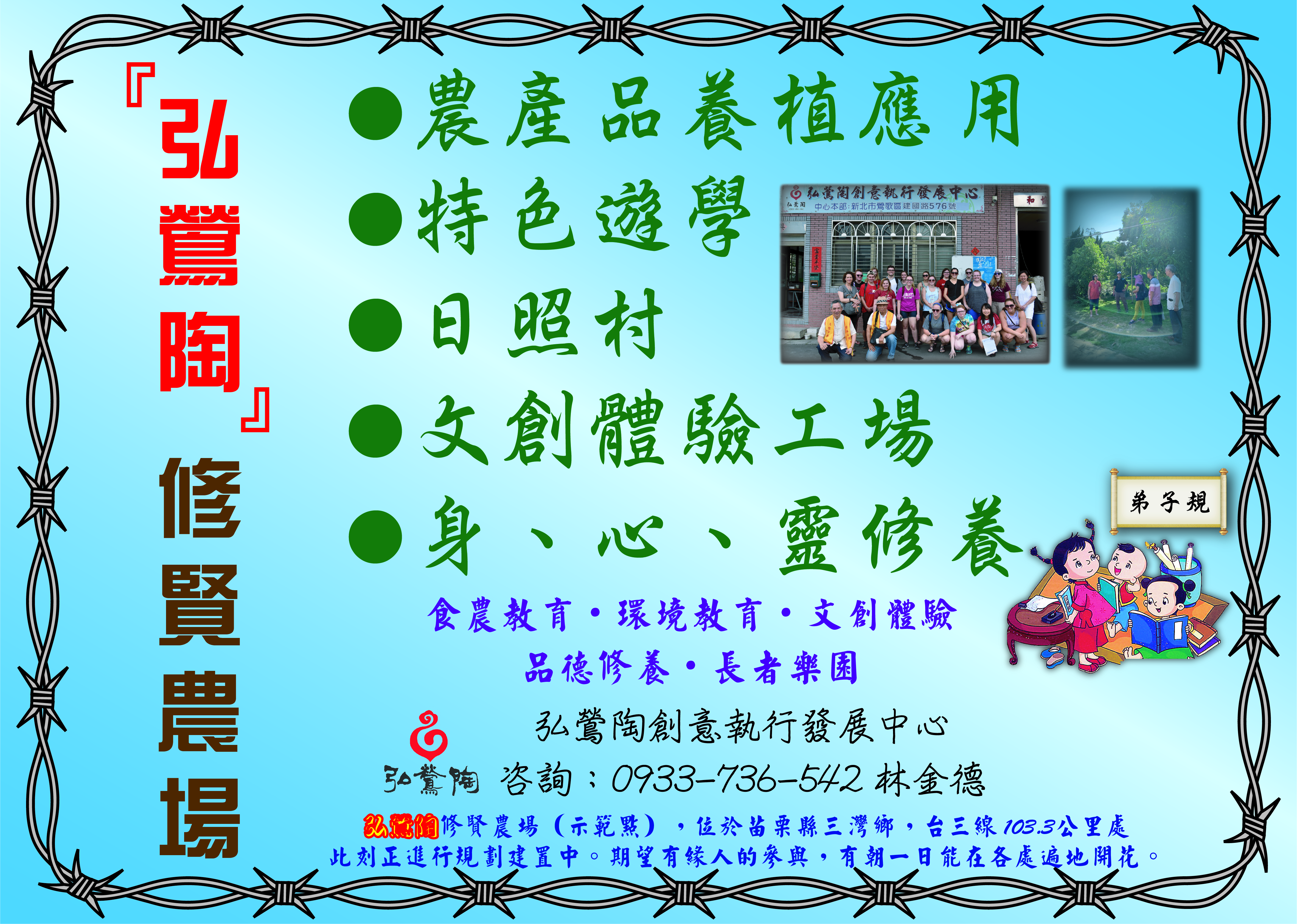 弘鶯陶修賢農場(示範點),位於苗栗縣三灣鄉,台三線103.5公里處,此刻正進行規劃建置中。期望有緣人的參與,有朝一日能在各處遍地開花。